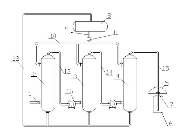 4. As described in claim 1 or 2, the diamond micro-powder pickling waste gas treatment device is characterized in that the alkali washing tower includes a first-level alkali washing tower, a two-level alkali washing tower and a three-level alkali washing tower, the intake port of the first-level alkali washing tower is connected with the pickling waste gas pipe, and the air outlet of the first-level alkali washing tower is connected with the intake port of the second-level alkali washing tower through the first exhaust pipe. The air outlet of the secondary alkali washing tower is connected to the air intake of the tertiary alkali washing tower through the second exhaust pipe, and the air outlet of the tertiary alkali washing tower is connected to the buffer settling barrel through the third exhaust pipe. The first exhaust pipe and the second exhaust pipe are provided with fans.